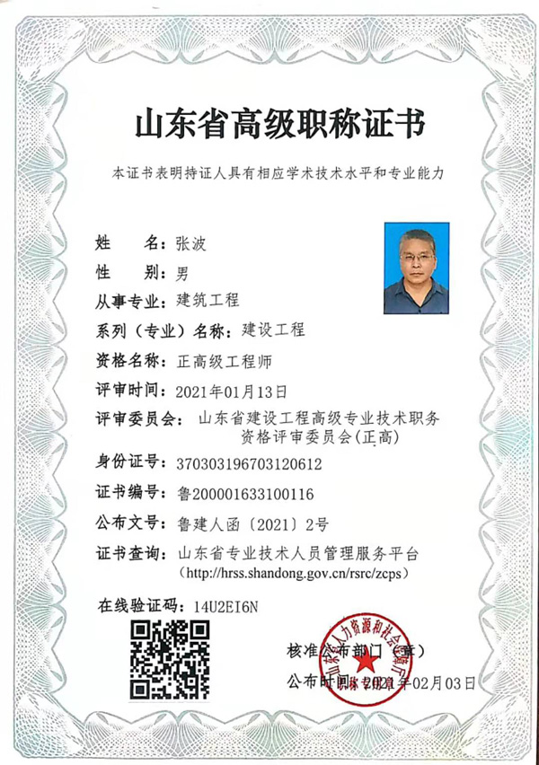 马博网投注重人才培养与使用,马博(中国)总工程师张波2021年2月3日取得山东省人力资源和社会保障厅核准颁发的“山东省建设工程正高级工程师职称证书”。同时获得中共淄博市委组织部、淄博市人力资源和社会保障局颁发的“淄博市高层次人才精英卡”,及依据淄博市人民政府“淄博人才金政37条”获得政府补贴奖励10万元。